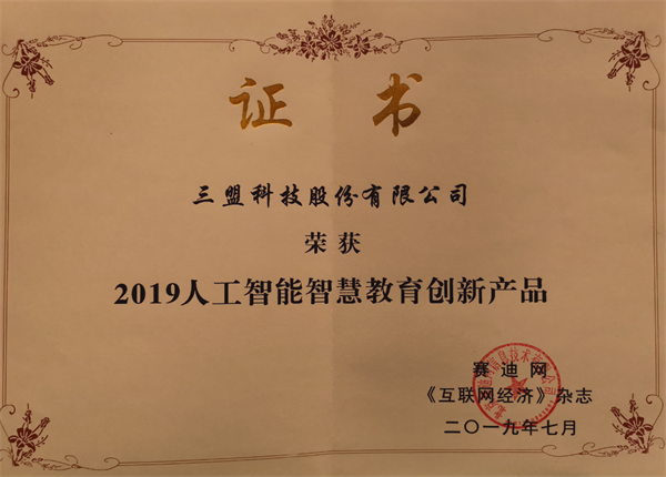 2019年7月26日,由中国电子信息产业发展研究院指导,赛迪网、《互联网经济》杂志联合举办的“2019行业信息化技术创新发展峰会暨行业信息化奖项评选”在北京举行,三盟科技股份有限公司(以下简称“三盟科技”)作为新一代智慧教室解决方案供应商,再获认可,摘得“人工智能智慧教育创新奖”。(下图中间)