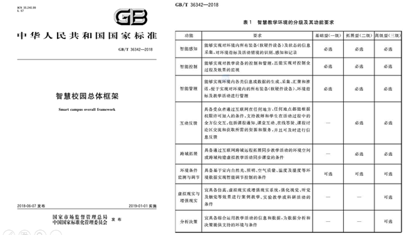 2019年1月1日,国家标准化管理委员会颁布的《智慧校园总体框架(GB/T 36342-2018)》,从智能感知、智能控制、智能管理、互动反馈、跨域扩展、环境条件监测与调节、虚拟现实与增强现实和分析决策等8个方面对智慧教学环境进行了定义,巧合的是,从2016年起,三盟科技就在企业内部以8个方面提出智慧教室建设的要求,与国家标准委提出的要求吻合。