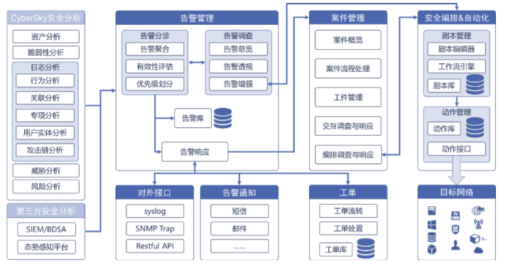 盛华安的 Cybersky-SOAR 主要包括告警管理、案件管理、工单管理、安全编排与自动化、威胁情报应用五大功能。