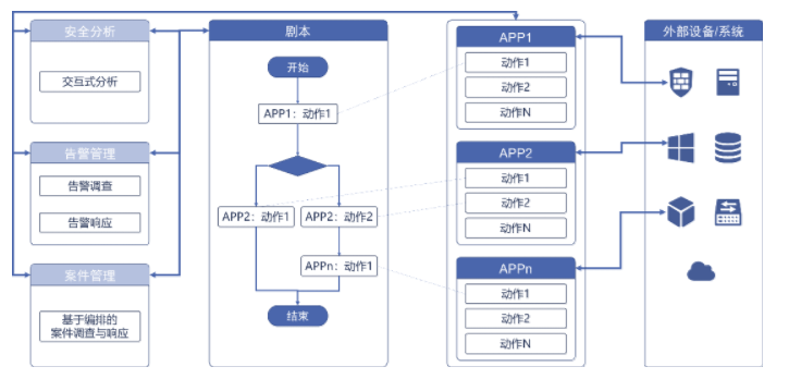 安全编排与自动化是 CyberSky-SOAR 的核心功能,实现了剧本的编辑维护,以及应用和动作的管理。安全编排与自动化的核心是剧本库和应用库(动作库)。这些库可以被安全分析、告警管理和案件管理等功能随时调用。通过该功能,真正实现了 SOAR 将不同的系统协同联动起来的目标,就像一个交响乐对的指挥。