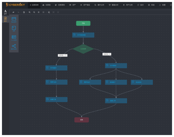 下图展示了 CyberSky-SOAR 的一个典型的剧本可视化编辑界面: