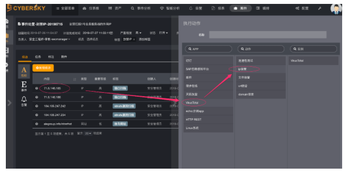 下图展示了在案件管理中调用外部威胁情报系统 (VirusTotal) 动作的界面:
