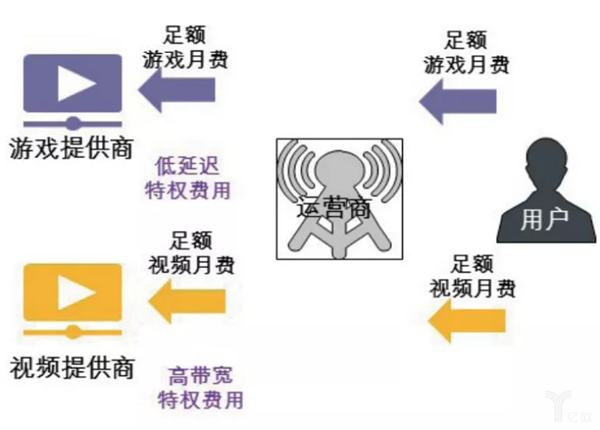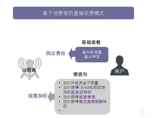 其次是基于内容合作伙伴的间接收费模式(如图5):类似4G时代的后向收费模式,但5G的可为空间更大。一是内容提供商类型更多,像VR/AR、云游戏等提供商将大量涌现;二是5G网络的可操作空间更大,可充分基于延迟性、带宽分层等定制收费。