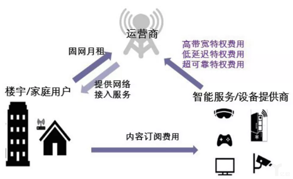 此外,“基于内容合作伙伴的间接收费模式”还可延伸至家庭无线固网接入业务上。运营商除了向前端楼宇/家庭用户收入固定接入费,还可以向智能服务/设备提供商收入网络分层的特权费用(如图6)。但这需要运营商提早部署智慧家庭生态建设与统筹能力。