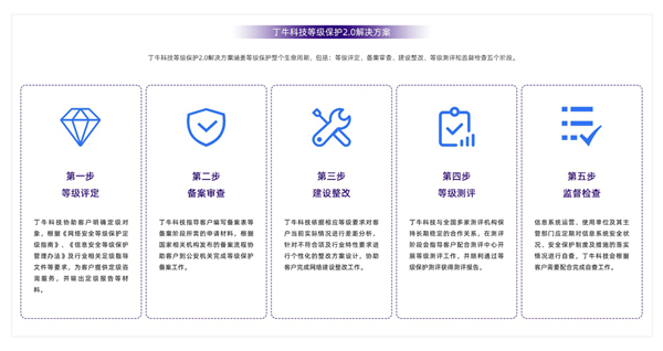 丁牛科技“DigApis等级保护2.0解决方案”涵盖等级保护整个生命周期,包括:等级评定、备案审查、建设整改、等级测评和监督检查五个阶段。服务团队成员平均从业年龄10年以上,在等保建设整改及咨询方面,拥有丰富的安全服务与工程实施经验。