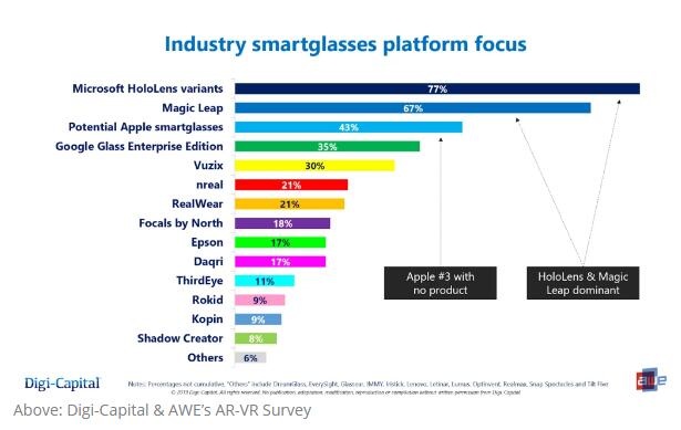 尽管没有智能眼镜产品,但在Digi-Capital和AWE(Augmented World Expo)最近对AR/VR行业内部人士进行的调查报告中,苹果成为排在微软HoloLens和Magic Leap之后的第三大智能眼镜平台。