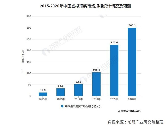 据前瞻产业研究院发布的《中国虚拟现实(VR)行业发展前景预测与投资战略规划分析报告》统计数据显示,2015年中国虚拟现实市场规模仅仅15.8亿元。之后呈现出高速增长态势。截止至2017年中国虚拟现实市场规模增长至52.8亿元。初步测算2018年中国虚拟现实市场规模将突破百亿元。预测2019年中国虚拟现实市场规模达225.6亿元,并预测在2020年中国虚拟现实市场规模将突破300亿元,达到300.9亿元。