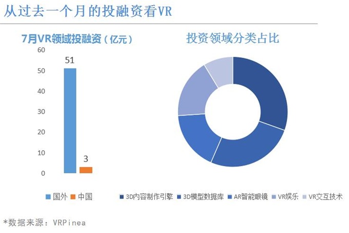 据VR垂直媒体VRPinea的数据,仅在今年7月,全球完成14笔VR/AR行业投融资,总金额超54亿人民币,其中国内共计3亿元人民币、国外累计7.4亿美元(51亿人民币)。融资方向依旧偏向于硬件、技术、内容等多个领域,包括VR/AR音频、AR眼镜、制作引擎等。