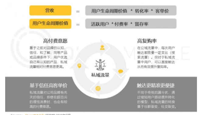 高复购率——在公域流量中,每次用户触达都需要一定支出(搜索流量)。但对于私域流量中用户,可以直接触达而有效提升复购率。