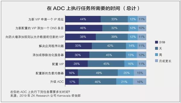 升级、配置新负载均衡器和配置新VIP耗费的时间最长。以发展的眼光来看,这预示着一些重大问题。随着数据中心被分解并且变得越来越多分散,IT部门需要在更多地方部署大量基于软件的ADC。花费数天、数周或数月来执行这些功能将导致企业在竞争中处于落后局面。