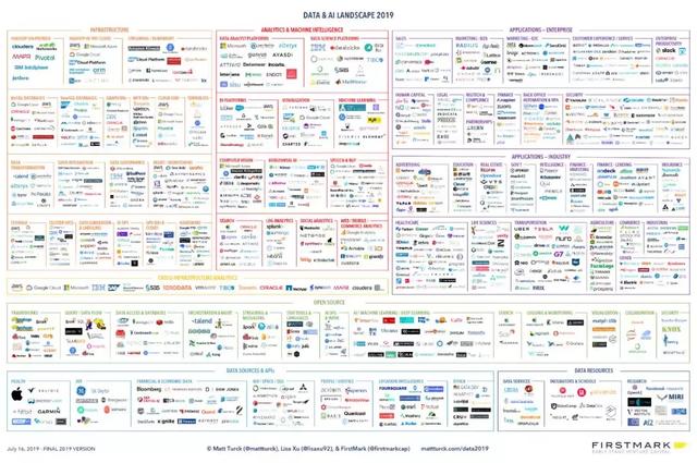 mattturck.com网站每年会发布数据及AI生态图谱,下图是最新的2019年图谱,可以看到和数据相关的企业非常多,涉及的领域也非常复杂。
