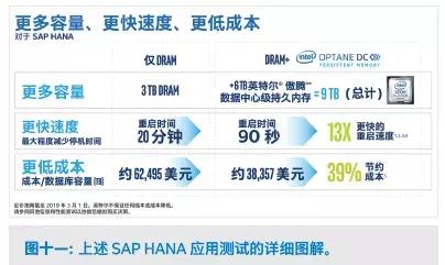 SAP测试了HANA在3TB DRAM内存平台,以及在3TB DRAM内存+6TB英特尔®“傲腾™”数据中心级持久内存平台上的表现,让系统重新启动从20分钟缩短到90秒,实现了13倍的提示,并使每TB数据库容量成本节约39%。