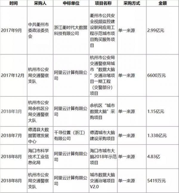 以上是根据公开资料整理的阿里云部分“城市大脑”中标项目,其中,浙江衢时代大数据科技有限公司,是阿里与衢州市政府战略合作协议下的SPV(特殊项目公司);千寻位置(浙江)有限公司则由阿里与中国兵器工业集团合资成立。