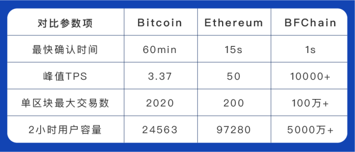 截至2019年7月,BFChain已累积包括多维分片扩容技术、离线交易等在内的64项技术专利获得国家初审通过,TPS峰值突破10000+,远超Bitcoin、Ethereum两大经典区块链项目。