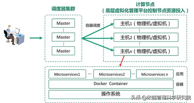 云原生架构既指软件架构,也指软件部署方式。一个大型系统由各种服务组成,每种服务都支持集群计算,每种服务的集群可以部署在任意虚拟机、物理机、容器之中,可以跨越设备、网络,实现异构环境下资源的集中管理、弹性计算。应用系统可靠性不再依赖于底层主机和物理部件的可靠性,基于容器、完全自动智能管理计算资源可称为“云原生架构”。目前主流的云计算容器服务是Kubernetes(google开源项目)+Docker,其应用架构如下图所示。