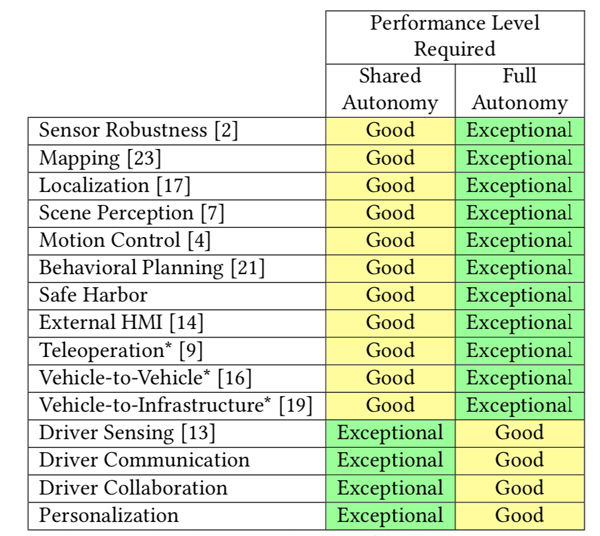 在实现高等级自动驾驶的方法上,传统思路全程都跳过了对「人」这个因素的考虑,精力主要集中在对地图、感知、规划以及表 I 中「全自动驾驶」一栏标注为「exceptional」的技术上。实际来看,考虑到目前的硬件和算法能力,这种解决方案对高精度地图、传感器套件的鲁棒性要求很高,提供的是较为保守的驾驶策略。