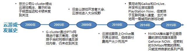 云游戏优点很多,最突出的就是摆脱了本地硬件性能的束缚,这样开发者在开发游戏时不用担心万家侧的硬件性能,可以开发出质量更高的内容,玩家端也可节省硬件迭代升级的成本。但其的前期发展并未如想象中那么顺利,其实早在20年前芬兰的G-cluster公司就已提出了云游戏的概念,后续也有OnLive 、EA、育碧、Take-Two、索尼、NVIDIA等游戏厂商的追随,但受限于技术壁垒的限制,云游戏始终未受到大家的重视。