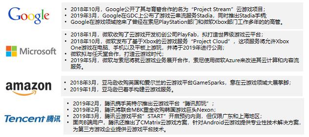 2015年之后,得益于计算机行业中CPU及GPU、云计算行业中虚拟化技术以及通信行业中WIFI/视频编解码/5G/MEC等技术的逐渐成熟,使得云游戏厂商打破技术壁垒的限制,云游戏得到了快速发展,并逐渐走向正轨,这一点也可从全球云计算巨头Google、Microsoft、Amazon、腾讯等发布的产品、技术以及商业方面的相关合作、收购等得以体现。