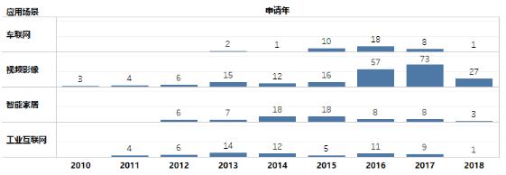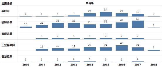 通过重点厂商在5G技术的专利申请趋势发现,华为、中兴都拥大量5G技术相关的专利申请,且2011年之后,5G技术专利申请都维持着较高的专利申请量,尤其在2016年,专利申请数量达到小高潮。5G技术的积累为5G场景应用提供了更多的可能性。