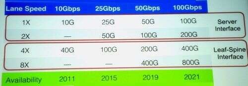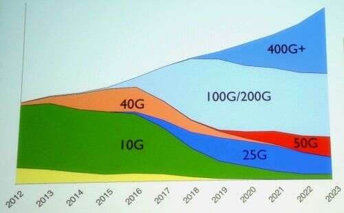Dell'Oro预测400G以太网的收入将快速增长(见上图)。Bechtolsheim则预测(见下图)50G/道的以太网标准的存在颇为短暂,IEEE的标准制定可能会跳过这个速度。