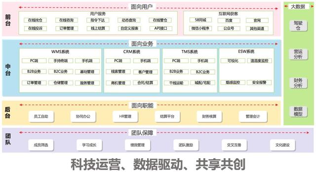 下图是B企业的数字化转型规划。B企业的目标是为小微企业提供“一平米起租、灵活租期”的仓配服务,因此,数字化转型的重点,是实现实时、低成本服务海量小微客户,满足企业全方位的需求。要实现这些低成本、强大的前台能力(比如在线订仓和在线管仓,在线分析),没有强大的中台系统支撑,是很难做到的。