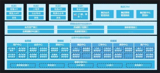 基于双中台的会员营销解决方案在这样的大背景下孕育而生,且在房地产行业已经有了落地实践,房地产企业多业态局势形成后,客户运营体系开始搭建。基于强大的企业数字化平台(Dice),业务中台将可以共享的业务能力在集团层面沉淀,赋能每一个前端业务;数据中台搭建起属于地产行业的One ID,建立统一的用户中心、会员中心、营销中心、商品中心、订单中心、库存中心、商户中心,通过灵活配置的接口与各业态的触点打通,实现客户运营体系的业态融合、共享赋能。