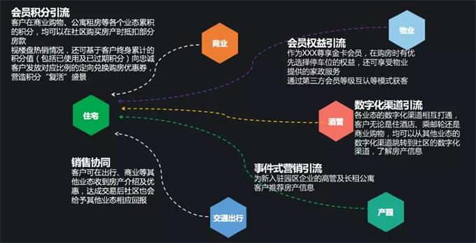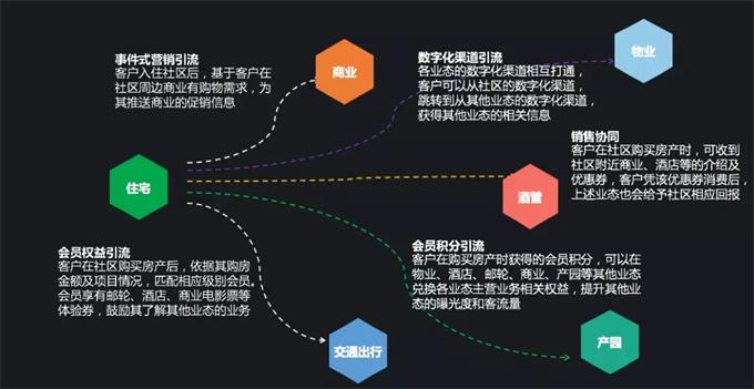 下面介绍一下某着名地产公司的案例,展现以住宅为主业的客户运营模式,是如何实现和其他的业态的融合赋能的: