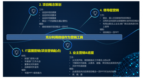 1、用谦卑的心态与姿态主推业主的想法(越是谦卑的人能力越强);2、成果和功劳都要转嫁给业主(信息化建设功能归根到底都是IT部门的);3、工作接触后要转换为工作外接触(十次聊工作不如一次聊生活)。 第四步:领导层营销。与业主达成了一致的项目概念后,CIO可以联名业主向企业其他领导层进行项目营销,尤其是向董事长推出具体的项目概念,加深即将要推行的项目在大家心目中的印象和概念。在跟领导层营销的过程中,CIO首先要充分借助业主的力量,跟业主是联盟,形成Double的力量;其次要利用干扰因素,比如不支持的人群来进行营销,因为与反对力进行辩论的过程都是高层参加的,这是非常有利的场景,只要你能舌战群雄;最后,利用外部因素,参加外部厂商主办的活动来进行营销,比如是工业4.0项目,可以参加工业4.0相关的分享活动。 通过以上四步,CIO把项目营销做到位,为后面的立项工作拉开序幕并打下坚实基础,把立项不通过的风险降到最低。