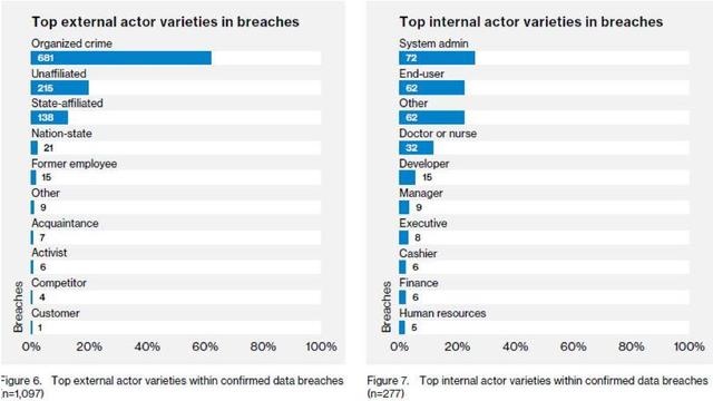 由于缺乏医疗行业的独立数据,我们以全行业数据来看威胁的构成。从全行业来看,在外部人员导致的泄漏事件中,62%都来自有组织的犯罪团伙;在内部威胁中,25.9%都跟企业系统管理员有关,终端用户占22.3%,医生或护士占11.5%,开发人员占5%。从这里可以看到很亮的数据:医生或者护士占11.5%。医生和护士只有在医疗行业才存在,也就是说,医生或护士造成的内部数据泄露事件在全行业中占据了11.5%的比例。