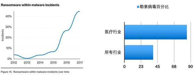勒索病毒是医疗安全的主要威胁。Verizon数据威胁报告显示,在医疗行业,高达85%的恶意软件面临勒索病毒威胁。Verizon报告特别强调,为了获得更多的收益,勒索者越来越倾向于企业级服务器,特别是数据库服务器,是核心勒索目标。基于Verizon报告我们可认为,只要成功防御了勒索病毒威胁,医疗数据外部安全风险就获得了相对安全。