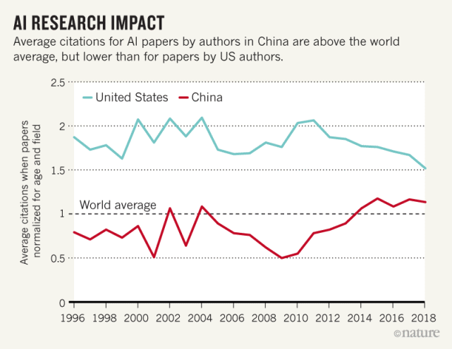 《Nature》近日的一篇分析文章表示,中国的人工智能研究在质量上进步很快,但是在高影响的论文、人才和伦理上面还需要追赶美国。