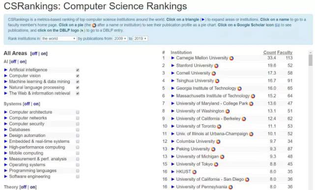 在计算机科学排名顶级学校排名(CSRankings)上,人工智能等领域上中国大学的影响力也在持续提升。这一排名完全基于研究指标,其度量了绝大多数院校教员在计算机科学领域各大顶会所发表的论文数量。