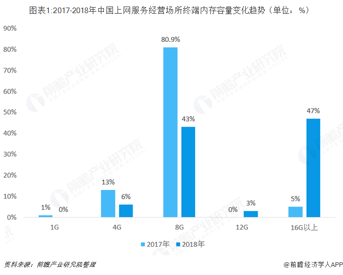 首先2018年全国上网服务经营场所终端扩容十分明显,8GB内存终端容量较2017年的80.9%呈断崖式下滑,仅为43%,受大逃杀类射击游戏盛行的影响,16GB以上内存的终端在一年内迅速提升至47%,成为2018年上网服务场所的主流内存配置。