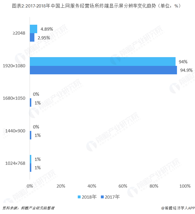 其次,国内上网服务行业经营场所终端显示屏也朝着超高清迈进,旨在给用户提供更为震撼的视听体验和真实的游戏效果。《2018年中国互联网上网服务行业发展报告》数据显示,2018年我国上网服务经营场所的终端显示器以1920×1080分辨率为主,少数经营者开始更换2048分辨率显示屏,占比从2017年2.95%上升至2018年的4.89%,未来超清屏幕、超大屏幕的比例将会继续提升,上网服务场所设备走向高端化。