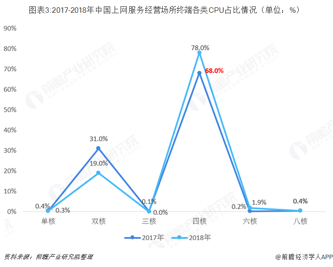 伴随着国内游戏品质的提高,上网服务用户对电脑终端配置的要求也逐渐提高,从而使得上网服务场所终端CPU不断升级。《2018年中国互联网上网服务行业发展报告》显示,2018年我国上网服务经营场所终端单核、双核、三核CPU的比例较2017年下降明显,基本已被市场淘汰。四核CPU成为市场的绝对主流,从2017年68%上升至78%,六核、八核CPU比重也不断上升。