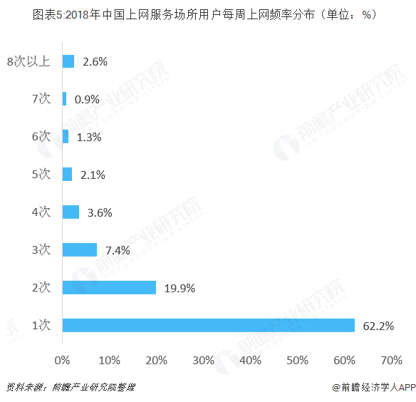 但从我国上网服务场所用户粘性来看,2018年有近4成用户每周上网次数在两次及以上,每周单次上网用户占比为62.2%,说明我国上网服务场所仍需改善服务质量,提高运营水平,提升用户的粘性。