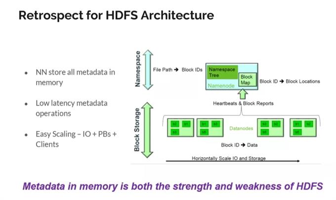 Scalability 主要是指 Hadoop 的分布式文件系统 HDFS 仍然有提高扩展性的需求和空间,后面会详细展开讲。Cloud 也是一个非常重要的方向,云上的对象存储甚至有取代 HDFS 成为云端大数据默认存储的趋势,所以 HDFS 如何与云端对象存储配合是一个重要的趋势。另一方面,随着机器学习 AI 的兴起,从数据存储的角度来看,这和传统大数据的存储方式很不一样,比如小的数据碎片会很多,这对 HDFS 带来了很多新场景和新挑战。
