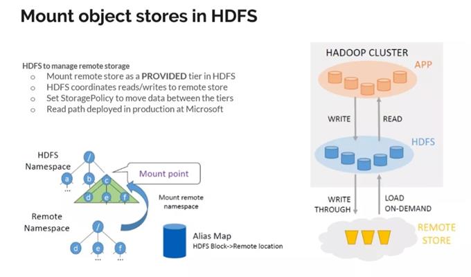 如图所示,在 HDFS 的命名空间的任何位置都可以设置挂载点来挂载远程的命名空间,标识成 PROVIDED 层次。HDFS 会通过 StoragePolicy 来管理数据在不同层次之间的移转。