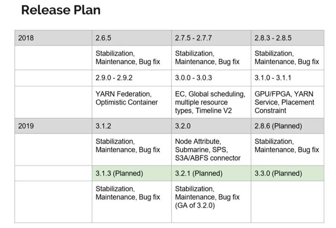 2019 年到目前为止做了两个 Release。3.1.2 是一个 Stabilization Release,3.2 加入了 Node Attribute,可以去 Tach,Node 可以在调度时做相应调度,也加入了 Submarine、HDFS 的 SPS,云的 Connector 上也有一些比较大的 Improvement。