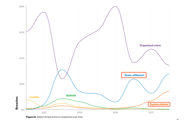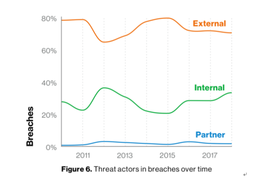 我们必须注意到,几乎在每个行业的数据泄漏来源占比中,内部威胁正在快速上升,以下为近 8 年来数据泄漏来源的统计占比图: