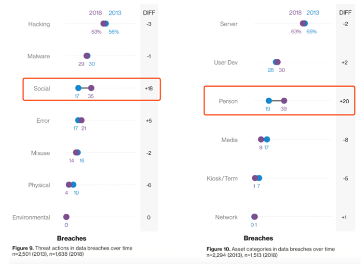 下图为全行业入侵手段和入侵目标的 5 年变更,可以看到社会工程攻击从 17% 增加到 35%,成为最为主流的入侵手段。而在入侵目标上,作为社会工程主要目标的个人则从 19% 增加到了 39%,具有高度相关性。