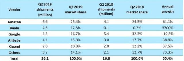 而百度旗下的智能音箱小度曾经在2019年的第一季度拿下了国内智能音箱市场的出货量第一的位置。而在第二季度小度以450万的出货量超过了谷歌,占据了全球17.3%的市场份额。而占据榜首的亚马逊则以660万的出货量占据了全球25%的市场份额。
