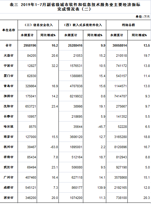 2019年1-7月副省级城市软件和信息技术服务业主要经济指标完成情况表(二)