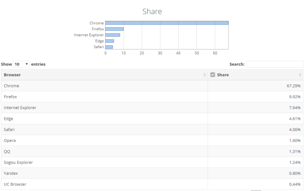 据 NetMarketShare 的最新统计数据显示,Google 的 Chrome、苹果的 Safari、微软的 IE 和 Edge 加上 Firefox,占据了全球浏览器市场总份额的 93.5%,其中 Chrome 就占了 67.29%。