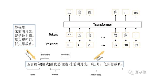 如上图所示,首先将示例诗歌转换为格式化序列。序列包括三个主要部分:格式、主题和诗体,中间用标识符分开。
