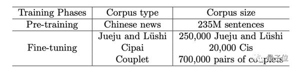 整体的数据集规模并不小,预训练用的中文新闻语料库,有2.35亿句子。微调用的数据集有25万绝句和律师,2万首词以及70万对对联。