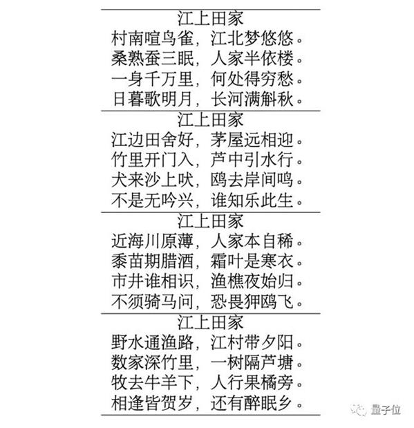 效果如何,华为也在论文中进行了充分的展示,比如下面这四首“江上田家”,只有一首是唐朝诗人写的,其他三首都是来自乐府AI。
