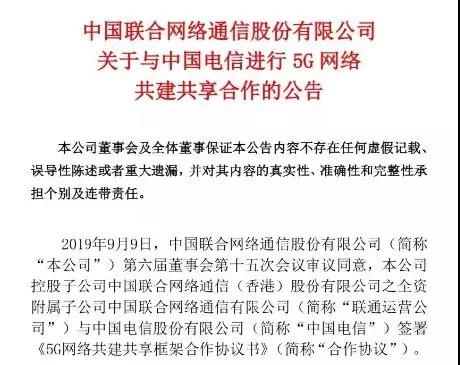 5G共建共享已不再是纸上谈兵了,随着中国联通9月9日晚间的一纸官方公告,传言许久的“中国联通和中国电信将共建共享5G网络”成为现实:2019年9月9日,中国联合网络通信有限公司与中国电信股份有限公司签署《5G网络共建共享框架合作协议书》。