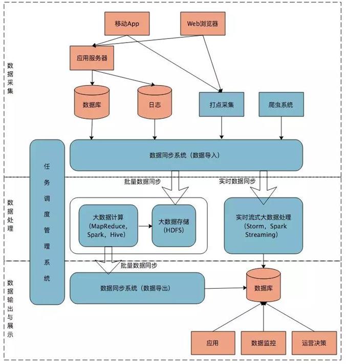 将应用程序产生的数据和日志等同步到大数据系统中,由于数据源不同,这里的数据同步系统实际上是多个相关系统的组合。数据库同步通常用 Sqoop,日志同步可以选择 Flume,打点采集的数据经过格式化转换后通过 Kafka 等消息队列进行传递。