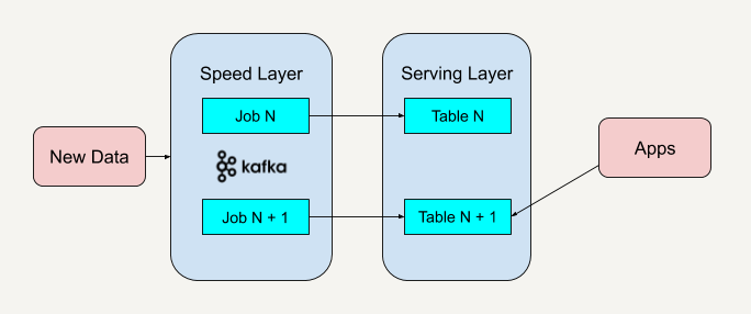 第三步,当这个新的数据视图处理过的数据进度赶上了旧的数据视图时,我们的应用便可以切换到从新的数据视图中读取。